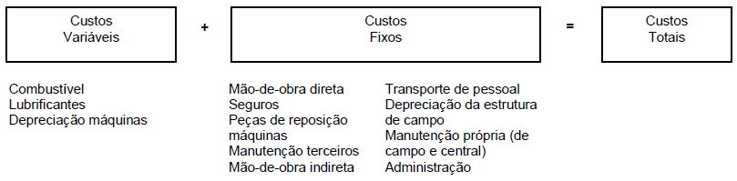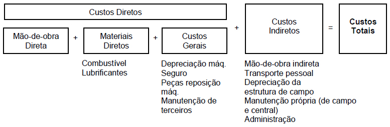 Dado o objetivo de custear o m3 de madeira cortada e descascada, de início os custos são classificados e mensurados em função da hora/máquina trabalhada, sendo este, portanto, o objeto de custeio. Para entender a relação de cada um dos elementos de custo com o objeto de custeio (hora/máquina trabalhada), faz-se necessário classificá-los em custos diretos e indiretos (Figura 6).
