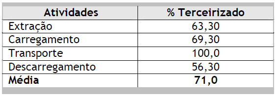 Enquanto algumas empresas optam por terceirizar apenas parte das atividades realizadas, outras transferem para terceiros todo o processo. Estudo realizado por Leite, Souza e Machado (2002) em 15 grandes empresas brasileiras de reflorestamento identificou que a adoção da estratégia de terceirização na colheita florestal situava-se conforme apresentado na Tabela 1.