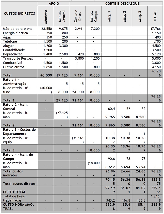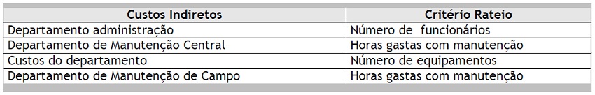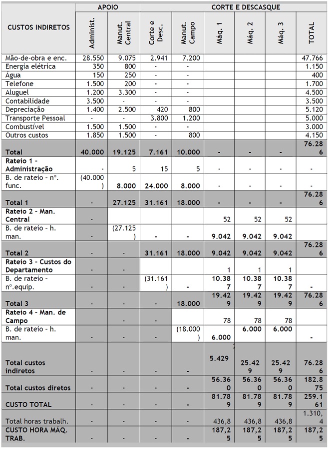 O tratamento dos custos indiretos em relação às máquinas, mas diretos em relação aos departamentos produtivos é o seguinte: (1) custos do departamento: diz respeito aos custos com supervisão, deslocamento dos funcionários e depreciação das estruturas de campo, sendo alocado a cada equipamento em função do número de máquinas existentes; (2) manutenção de campo: distribuídos entre as máquinas com base no número de horas gastas com manutenção.