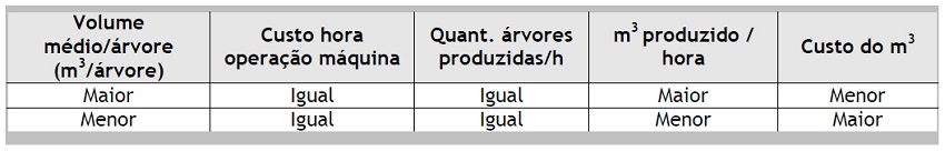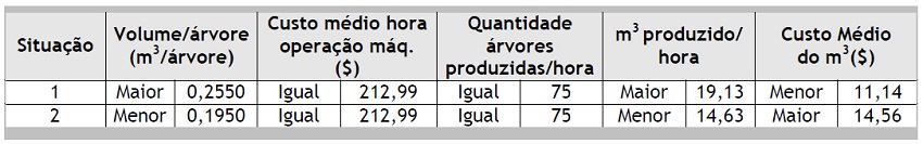 Todas as variáveis provocam algum tipo de impacto na produtividade dos equipamentos e nos custos, sendo a variável volume individual das árvores a mais relevante. De fato, características da floresta impactam diretamente nos custos do m3 de madeira, pois, quanto menor o volume da árvore, maior a quantidade de árvores necessária para se obter 1m3 na forma desejada. Em uma floresta com um volume médio de 0,2550 m3 por árvore, é necessário cortar e descascar 3,92 árvores para que se obtenha 1m3 de madeira (1/0,2550 = 3,92); já em uma floresta com 0,1950 m3 por árvore é necessário, em média, 5,13 árvores para que se obtenha o mesmo 1m3 (1/0,1950 = 5,13). Assim, se em uma hora de operação um equipamento cortar e descascar cerca de 75 árvores, sua produção é de 19,13 m3 para um volume médio de 0,2550 m3/árvore, ou de 14,63 m3 para um volume médio de 0,1950 m3/árvore. Esta questão de produtividade é mostrada no Quadro 2.