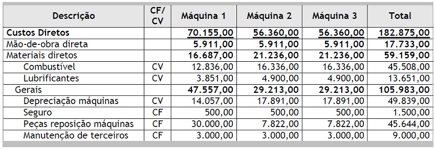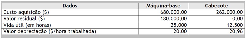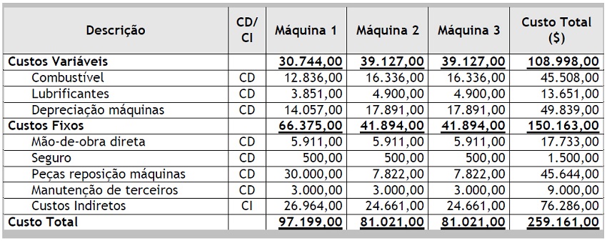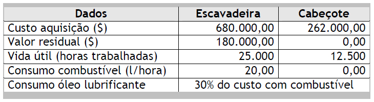 Ressalta-se que na empresa, para fins gerenciais, a depreciação não é calculada com base em uma taxa fixa, mas sim com base no número de horas utilizadas na produção, apuradas pelo horímetro do equipamento, resultando a quantidade total de horas correspondentes à sua vida útil. Com base nos dados fornecidos, os custos diretos de um mês de operação compõem-se do seguinte: