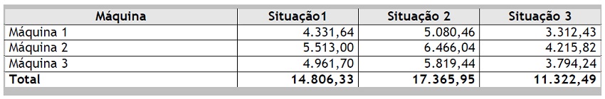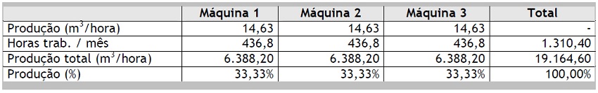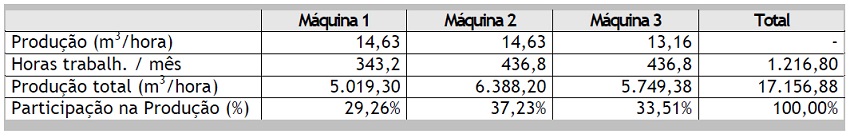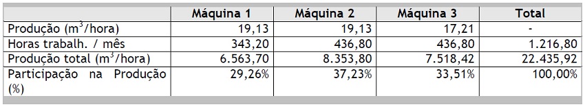 Adicionalmente, observa-se que a produção realizada por cada uma das máquinas não é uniforme, pois a disponibilidade operacional e a experiência do operador são diferenciadas. Assim, o estudo considera que a Máquina 1, como já demonstrado, tem uma disponibilidade inferior às demais e que a Máquina 3, embora possua condições de operação similares à Máquina 2, é operada por funcionários menos experientes, o que resulta em uma redução de 10% do m3/hora produzido. Assim, considerando-se que o serviço seja prestado em uma floresta em condições ideais de operação, a produção de cada um dos equipamentos, durante o mês, é a seguinte: