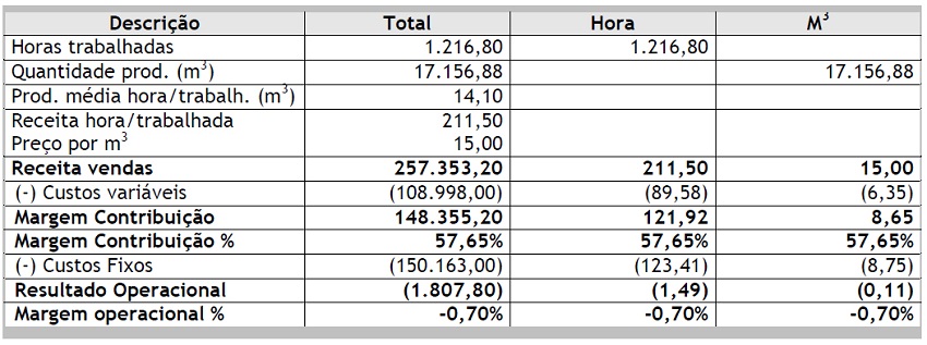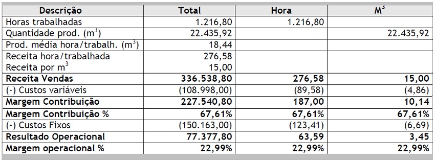 Com os dados da Tabela 8, através da soma dos custos indiretos rateados aos equipamentos, mais os custos diretos apurados na Tabela 7, obtém-se o custo total de operação de cada máquina. E, dividindo-se esse custo total pelo número de horas trabalhadas durante o mês, apura-se o custo da hora/máquina. Porém, ainda é necessário apurar o custo do m3 base do faturamento.