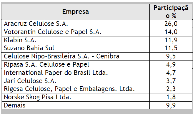 Segundo Carvalho, Soares e Valverde (2005), a indústria de celulose e papel é a mais bem sucedida do setor florestal. Dados da Bracelpa (2006a) indicam que em 2005 o setor participou com 1,4% do Produto Interno Bruto (PIB) brasileiro e compreende a atuação de 220 empresas, sendo 35 delas exportadoras habituais. A Tabela 2 relaciona os principais produtores de celulose e respectivas participações no mercado nacional.