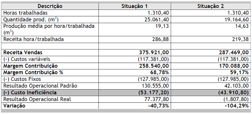 A análise da Tabela 19 evidencia que a ineficiência da empresa, decorrente dos equipamentos velhos e da pouca habilidade dos operadores, causa expressiva redução no resultado operacional. Logo, como já mencionado, estes são fatores que merecem uma atenção especial dos gestores.