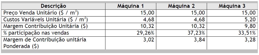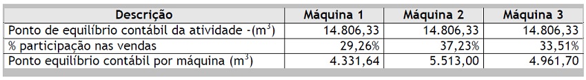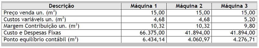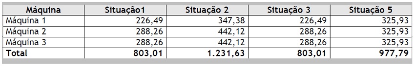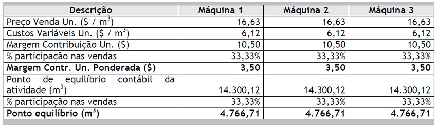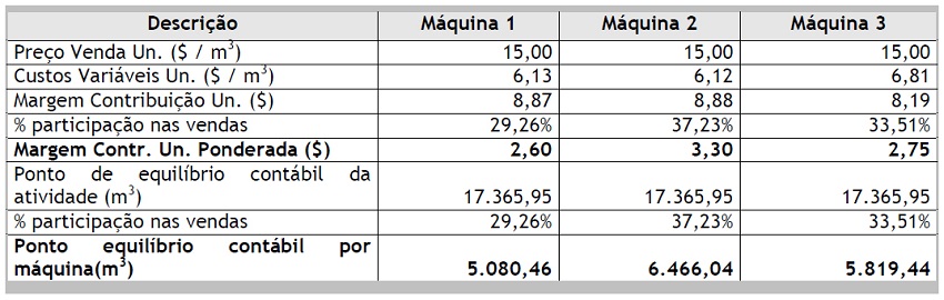 Tal fato pode ser constatado, por exemplo, por meio da análise do ponto de equilíbrio apresentado pela Máquina 1. Em qualquer uma das situações observadas é necessária a margem de contribuição das demais máquinas para cobrir os custos fixos da Máquina 1.