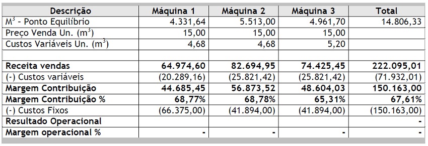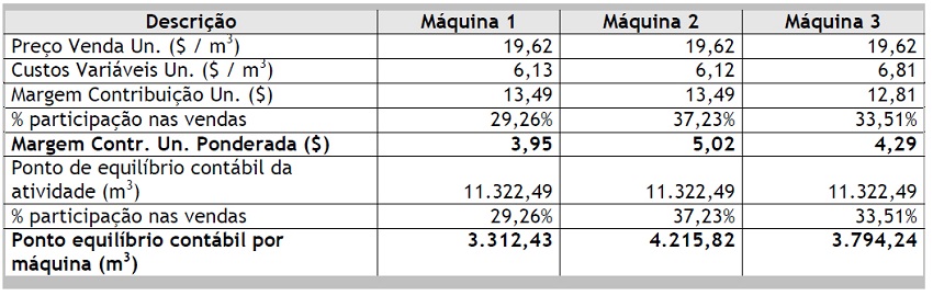 Neste contexto, tanto a análise do ponto de equilíbrio do conjunto de máquinas, quanto de cada uma delas de forma segregada, é relevante para que o gestor possa compreender de que forma cada equipamento contribui para a formação do resultado apresentado pelo departamento.
