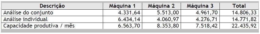 A Tabela 16 demonstra a produção total realizada no mês, considerando-se que todos os equipamentos da empresa operam em condições idênticas às condições de operação da Máquina 2.
