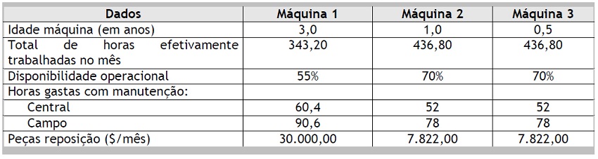 (2) total de horas trabalhadas/mês: a empresa opera em 3 turnos de 8 horas cada, 26 dias por mês (30 dias menos 4 domingos). A utilidade operacional dos equipamentos é de 70%: o restante (30%) é usado para manutenção/abastecimento do equipamento e repouso/alimentação do operador. Assim, o total de horas/máquina do mês é assim obtido: 24 horas x 26 dias = 624 horas; 624 horas x 70% = 436,8 horas/mês. O total de horas trabalhadas no mês varia de acordo com a idade do equipamento: quanto mais velho for, menor a disponibilidade dado o tempo com manutenções, principalmente corretivas. Considera-se que a empresa opera com os 3 seguintes equipamentos (Tabela 4):