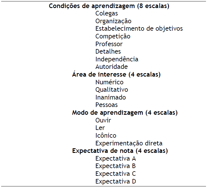 Sumarizando as dimensões e respectivas escalas consideradas no Inventário de estilos de aprendizagem de Canfield, apresenta-se a Tabela 1.