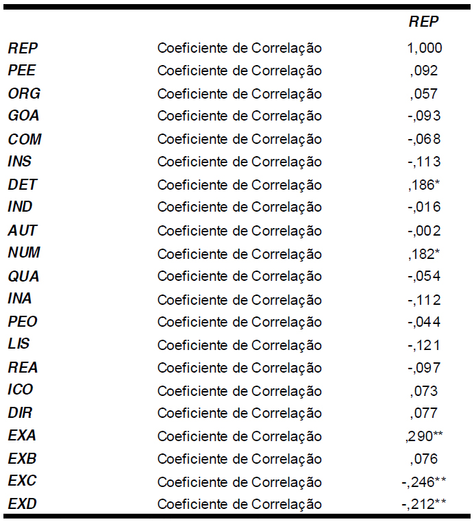 Analisando-se a correlação entre as variáveis (Tabela 2), verifica-se que a variável dependente REP - reprovação está correlacionada positivamente apenas com as variáveis independentes DET - detalhes, representando aquele indivíduo que valoriza saber cada situação específica, com informação detalhada sobre o que está desenvolvendo e a conseqüente avaliação que sofrerá; NUM - numérico, que caracteriza o discente que prefere trabalhar com números e lógica, computação e solução de problemas matemáticos; e EXA - expectativa A que reflete o nível de trabalho superior ou excelente que o indivíduo espera de si mesmo; e negativamente com EXC - expectativa C quando a expectativa que o aluno tem de si mesmo é de um desempenho médio; e EXD - expectativa D que reflete uma expectativa de fracasso pelo discente.