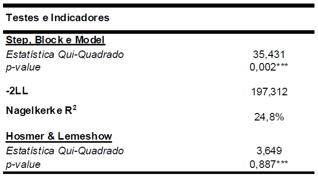 O poder explicativo do modelo é dado pelo indicador Nagelkerke R2; 24,8,3% das variações registradas na variável dependente são explicadas pelo conjunto de variáveis independentes.