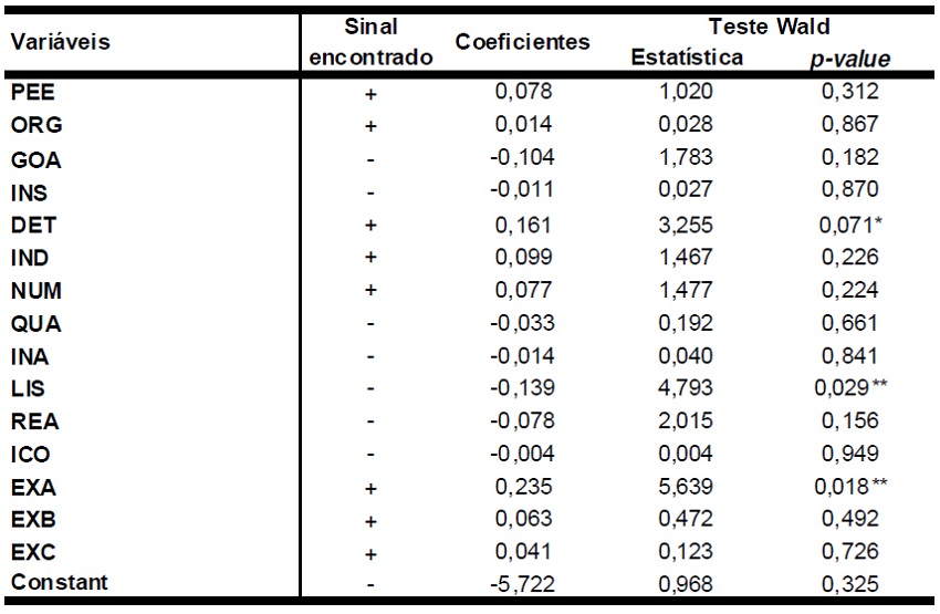 Considerando a questão de pesquisa, constatou-se que as variáveis Detalhes (DET), Ouvir (LIS) e Expectativa A (EXA) apresentaram coeficientes significativamente diferentes de zero no teste Wald, sugerindo que tais variáveis influenciam a probabilidade de um aluno reprovar em uma disciplina no Curso de Ciências Contábeis. Ou seja, de acordo com o LSI, os discentes com as características a seguir aumentam a probabilidade de reprovação: discentes cuja condição de aprendizagem é detalhista, que valorizam saber cada situação específica, com informação detalhada sobre o que é desenvolvido, como é feito, onde é feito e como será avaliado; cujo modo de aprendizagem preferido seja pelo canal auditivo com aulas expositivas, fitas, discursos; e, ainda aquele estudante que assume fazer um trabalho superior ou excelente relativo a sua expectativa de nota.