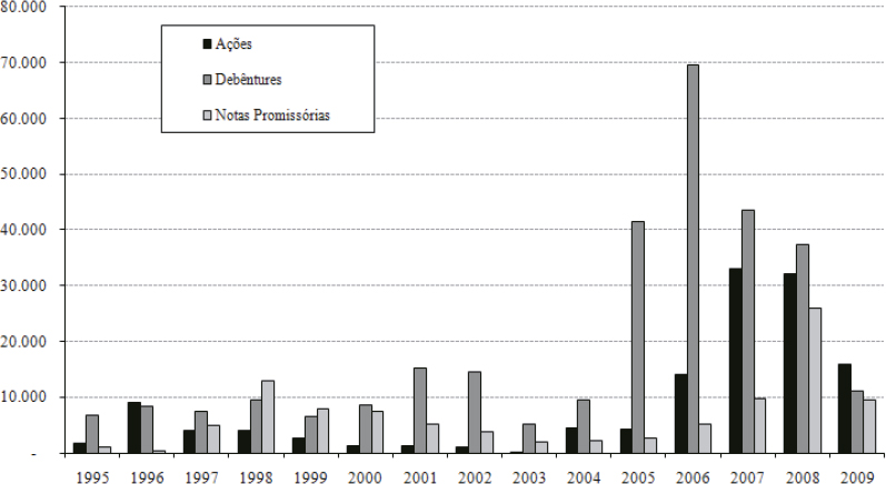 Desde o início do plano real, o mercado primário de debêntures tem representado a maior fonte de captações no mercado de capitais, condição ilustrada no Gráfico 1. As captações primárias por meio de debêntures são significativamente maiores que o mercado de ações e de notas promissórias. Essa tendência foi muito mais evidente nos anos de 2005 e 2006 - mesmo que grandes volumes captados sejam referentes às empresas de leasing, não é possível tirar o mérito desse instrumento no financiamento empresarial direto.
