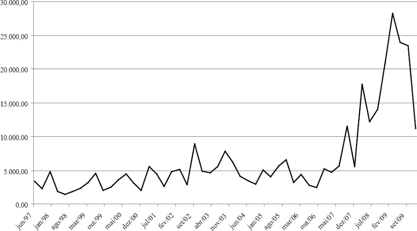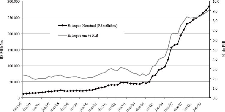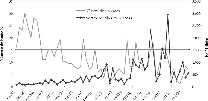 O estoque de debêntures, até 2005, representava menos de 3% do PIB e chegou ao patamar de 9% do PIB em 2009. Essa grande evolução foi impulsionada justamente pelo grande volume de captações ocorridas a partir de 2005 por empresas de leasing. Não obstante, é importante destacar que não houve grandes aumentos nos números de novas emissões, pelo contrário, o número médio entre 1995 e 2000 é maior do que o apresentado entre 2001 e 2009. Porém, o volume médio captado por emissão, na década de 90, é muito pequeno quando comparado ao de 2008. Em 2008, o volume médio de cada emissão chegou a ser maior que R$ 2,5 bilhões, conforme pode ser observado no Gráfico 3.