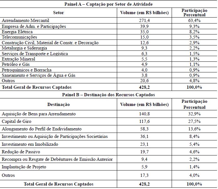 Nesse sentido, observando-se a alocação setorial e destinação dos recursos captados pelas debêntures, verifica-se que a maior parte dos recursos captados, especialmente as grandes emissões ocorridas em 2005 e 2006, foi derivada de captações por empresas de arrendamento mercantil (leasing), que representaram o montante de 63,4% de todas as captações ocorridas entre 1995 e 2009. No limite, essas captações também tiveram característica de intermediação financeira, isso porque os recursos captados serviam como funding de entidades financeiras para operações financeiras de arrendamento.