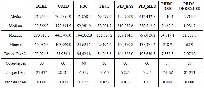 Dentre outros aspectos, é possível verificar que apenas as variáveis que servem como proxy do crescimento econômico (formação bruta de capital e produto interno bruto) podem ser consideradas como distribuição normal ao nível de significância de 1%. O número de observações é de 60 períodos sendo as emissões primárias com 59 observações.