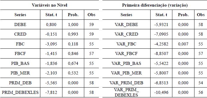 O teste ADF foi conduzido para cada variável considerando a inclusão de intercepto e tendência linear como variáveis exógenas e com seleção automática de defasagem. Foram testadas as variáveis no nível e na primeira diferença. A primeira diferença representa a variação nominal simples de um período para o outro, ou seja, trata-se do valor em t menos t-1.