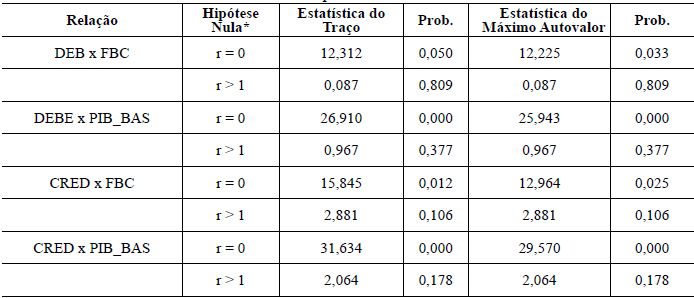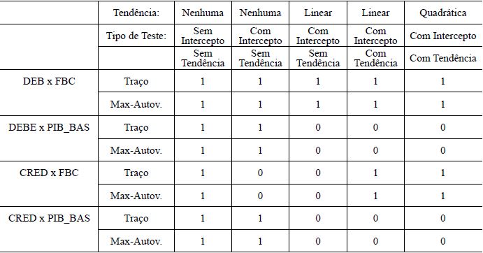 É possível verificar que todas as relações, tanto para debêntures como para crédito bancário, possuem ao menos uma possibilidade de vetor de cointegração. A abordagem que apresenta vetores de cointegração em todas as relações foi o modelo sem tendência e sem intercepto. Os dois primeiros testes envolvem a variável debênture (DEB) e sua relação com FBC e PIB_BAS e os dois últimos envolvem a variável crédito bancário (CRED). A utilização do PIB_BAS não apresenta resultados de cointegração com a inclusão de tendência.