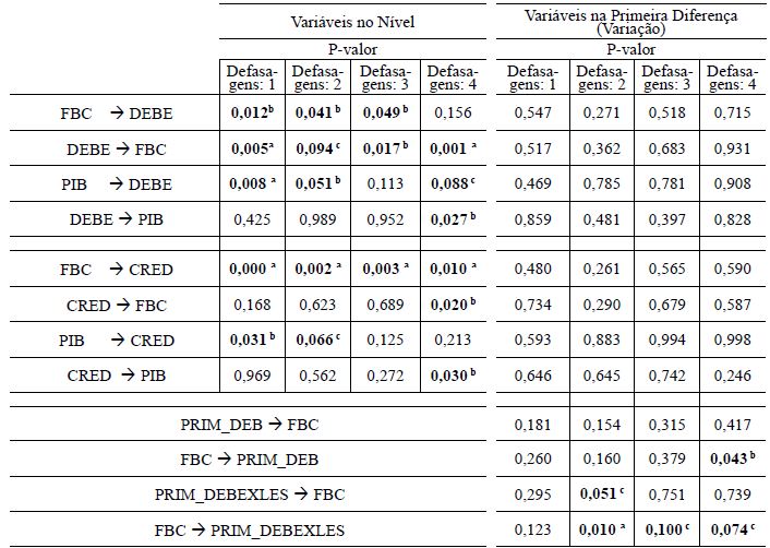 A fim de facilitar a apresentação dos dados, a Tabela 6 apresenta o P-valor para cada relação em ambos os sentidos, ou seja, medida de crescimento econômico (FBC e PIB) causando aumento nos instrumentos de captação (DEBE e CRED) e instrumentos de captação causando crescimento econômico. Assim, quando P-valor for menor que 1%, 5% e 10% a causalidade é considerada significativa ao respectivo nível de significância. Para facilitar a visualização, as causalidades de Granger significativas estão destacadas na tabela.