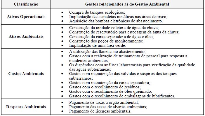 A seguir são apresentados, no Quadro 1, os gastos incorridos pelo posto de combustível para a implementação das medidas de gestão ambiental, bem como sua classificação quanto aos grupos patrimoniais. Para a classificação contábil desses gastos foram considerados os seguintes grupos patrimoniais: ativos ambientais, custos ambientais e despesas ambientais.