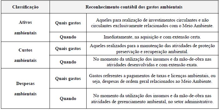 Ribeiro (2006) também corrobora essa classificação, ao considerar como despesas ambientais, todos os gastos envolvidos no gerenciamento ambiental, que sejam consumidos no período e incorporados na área administrativa, nesse sentido, serão consideradas despesas ambientais, todas aquelas incorridas em qualquer departamento que desenvolva atividades relacionadas à proteção ambiental. Nessa etapa do estudo foram realizadas a identificação e classificação dos gastos relacionados às atividades de gestão ambiental. A próxima etapa do trabalho explicita como deve ser realizado o reconhecimento e a evidenciação contábil desses gastos.