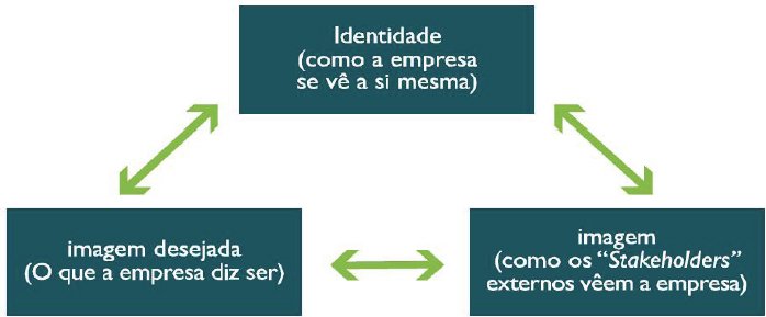 Dessa forma, conforme a figura abaixo, a empresa pode ser vista a partir de diferentes prismas: de como ela se vê, de como os stakeholders a vêem e de como ela deseja ser vista: