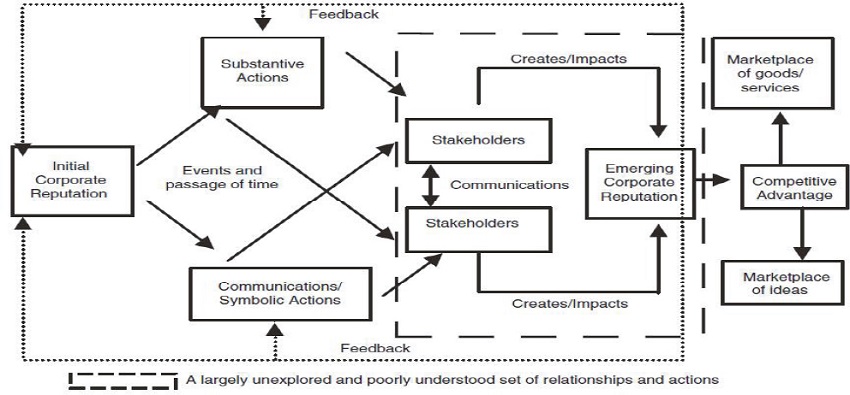 O autor ainda demonstra que os pesquisadores de marketing tratam de reputação ligada à estratégia, buscando trabalhar no contexto da marca dos produtos ou serviços, enquanto aqueles que trabalham com comunicação corporativa se dedicam a estudá-la num papel de administração de crises e de imagem da organização. Por sua vez, os pesquisadores de relações públicas caminharam semelhantemente, incorporando apenas as comunicações e a análise histórica. Para um grupo em especial, a reputação é como sua própria área distinta de estudo e pesquisa, para outro, porém, a avaliação de desempenho incorporado de um ponto de vista de investimento, podendo ser formada em cada e toda interação entre qualquer empregado da empresa e qualquer cliente (potencial ou real) (MAHON, 2002).