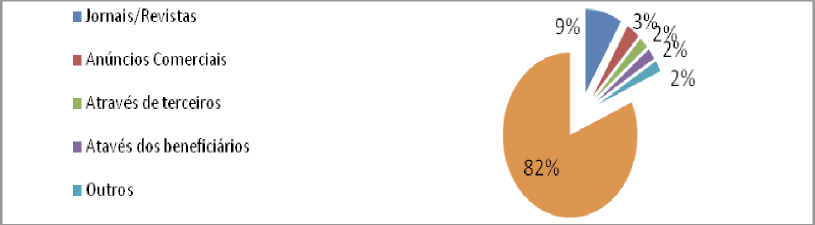 Uma vez percebida alguma das ações sociais, verificou-se quais seriam as fontes desse conhecimento. O grupo de funcionários tomou conhecimento das ações por meio de informações dos jornais e revistas internas e externas, bem como as demonstrações contábeis, outras fontes e anúncios comerciais, sendo ínfima a participação dos terceiros e beneficiários, neste processo informativo. No caso da sociedade, dos poucos respondentes que conheciam alguma ação social, a maioria, assim como no grupo de funcionários, tomou conhecimento dessas ações através de revistas e jornais, e, em seguida, por meio dos anúncios comerciais.