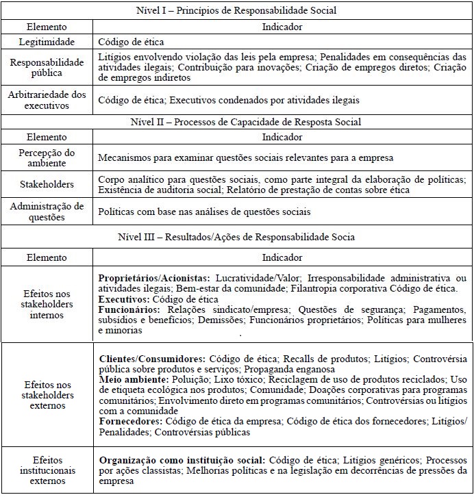 Para Queiroz (2001), a premissa do modelo é orientada para ações de responsabilidade social passe a ser uma prática usual e diária no ambiente interno das corporações, em que se compreenda que o seu papel na sociedade. No quadro a seguir são elencados os elementos e indicadores discorridos por Hopkins.