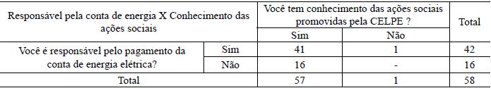 Essa divisão foi confrontada com as respostas dos questionários sobre o conhecimento ou não das ações sociais promovidas pela Celpe. No caso dos funcionários, apenas um dos 58 funcionários, não tinha conhecimento das ações, ficando assim: