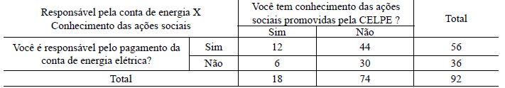 Na sociedade, constatou-se que 80% (74) dos entrevistados não percebiam as práticas sociais promovidas pela Celpe, mesmo os respondentes responsáveis pela conta de energia. Destes últimos, apenas 21% conheciam alguma das ações sociais.