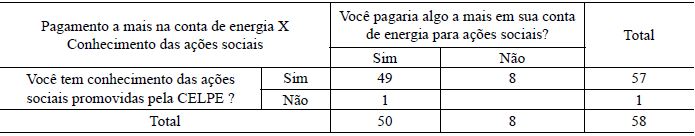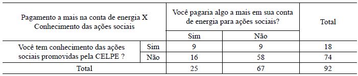 Já na sociedade, apenas 27,17 % pagariam algum valor a mais em sua conta de energia elétrica, que fosse destinado a ações sociais. Esse número está aquém das expectativas, porém ressalte-se, que 16 destes que pagariam não têm conhecimento das ações. A partir desses dados, desenvolveu-se a seguinte tabela: