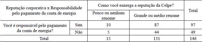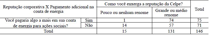 Para as análises referentes à percepção dos stakeholders e reputação corporativa, foram associadas variáveis respondidas pelos entrevistados, sobre responsabilidade no pagamento da conta de energia, conhecimento das ações sociais e pagamento de uma quantia adicional na conta, com a variável atribuída a reputação corporativa atribuída à Celpe. Dos questionários preenchidos, quatro não responderam sobre a reputação da empresa. Estes serão excluídos das análises a seguir.