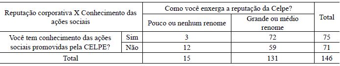 No caso em tela, as pessoas que tinham conhecimento de alguma ação social atribuíram uma melhor reputação à Celpe. Para a amostra em questão, houve uma forte associação entre as variáveis de responsabilidade social e de reputação corporativa.