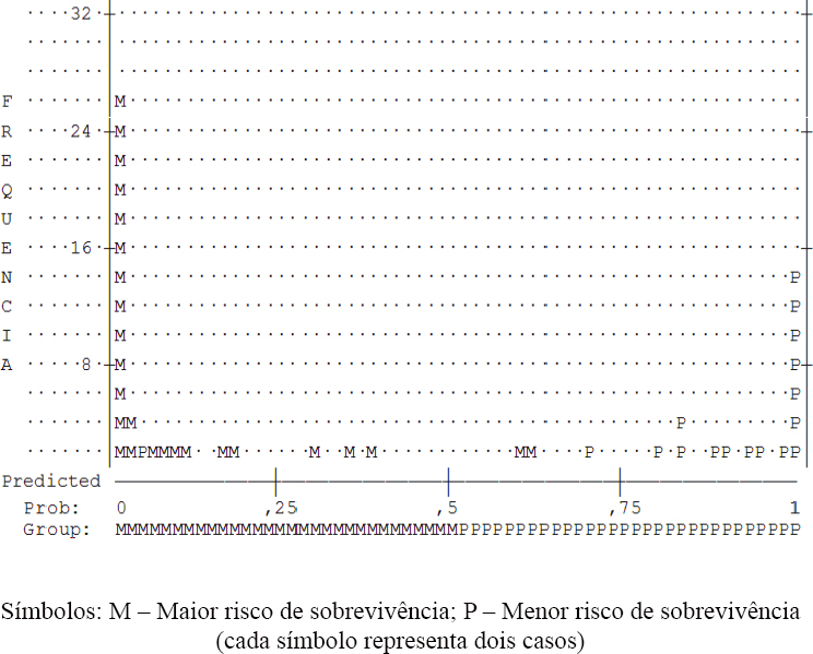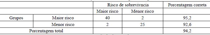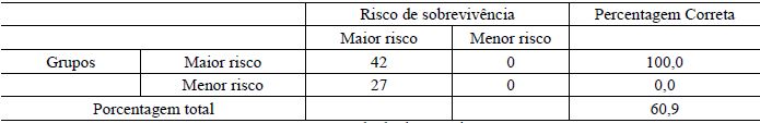 A Tabela 1 informa como seriam classificados os indivíduos caso o modelo de risco de sobrevivência se deixasse guiar apenas pela situação em que se enquadra a maioria dos casos observados. Utilizando os procedimentos discorridos na metodologia, a amostra foi dividida em dois grupos: 42 no grupo de maior risco de sobrevivência e 27 no grupo com menor risco de sobrevivência. Isso significa que o modelo classificaria corretamente aqueles que atuam no comércio da tecelagem tradicional apenas para complementar a renda ou por gosto pela atividade, mas que não tem a atividade como fonte principal de trabalho e renda. A priori, espera-se que o grupo com maior risco de sobrevivência seja composto por MPE com menos de 5 empregados, com faturamento inferior a média mais um desvio padrão, entre outras características compostas nas variáveis utilizadas. Deixa-se claro que a classificação foi relativa entre as MPE da amostra. Nesse caso, o percentual geral de acerto nas classificações seria de aproximadamente 61%. Esse quadro de classificação anterior à análise atua, portanto, como uma referência para avaliar a eficácia do modelo quando ele passa a operar com as variáveis independentes para predizer a que grupo pertence certo indivíduo.