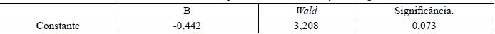 A Tabela 2 exibe o quadro da estatística Wald, que nesse primeiro momento está avaliando a significância da constante incluída no modelo. Do exposto, conclui-se que seria conveniente formular predições em função desse critério de classificação, visto que o nível de significância foi de 7,3%. O objetivo dessa estatística é fornecer uma base de comparação que permita verificar se as variáveis independentes vêm melhorar a qualidade das predições. É importante considerar que sem incluí-las no modelo já se alcança um nível de acerto aproximado de 61% na classificação dos casos. Com elas, espera-se um percentual mais elevado.