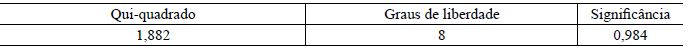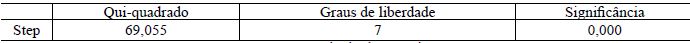 O modelo Qui-quadrado testa a hipótese de que todos os coeficientes da equação logística são nulos. O valor do modelo, como mostrado na Tabela 3 foi de 69,055. O Likelihood (-2LL) e a diferença entre os valores iniciais e finais desse indicador expressam a capacidade preditiva do modelo. Esse número corresponde à diferença entre o valor de (-2LL) obtido quando se inclui apenas a constante no modelo e o (-2LL) calculado após a inclusão de todas as variáveis independentes. Com a inclusão das variáveis independentes, espera-se que o Likelihood Value sofra uma redução estatisticamente significativa. Com 7 graus de liberdade verificou-se uma redução significativa e pode-se concluir que pelo menos um dos coeficientes da regressão logística é diferente de zero. Portanto, pode-se rejeitar a hipótese de que todos os parâmetros estimados são nulos. Em outras palavras, pode-se afirmar que eles contribuem para melhorar a qualidade das predições.