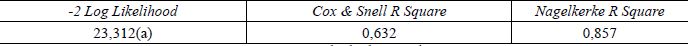 Na Tabela 4, os testes Cox & Snell e Nagelkerke são considerados pseudos-R². Eles procuram indicar a proporção das variações ocorridas no log da razão de chance que é explicada pelo conjunto das variáveis independentes. Assim o Cox & Snell está indicando que cerca de 63,5% das variações ocorridas no log da razão de chance são explicadas pelo conjunto das variáveis independentes. Com significado semelhante ao coeficiente de determinação, o Nagelkerke considera que o modelo é capaz de explicar 85,7% das variações registradas na variável dependente.
