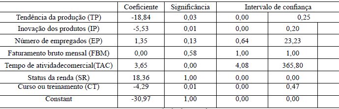 Submetido a todos os testes, verifica-se que o modelo está estatisticamente apto a ser utilizado na solução do problema de investigar a probabilidade de sobrevivência das MPE comerciais da tecelagem tradicional de Resende Costa. Desta forma, podem-se esboçar a equação da regressão logística com boa margem de segurança. Desta maneira pode-se excluir as variáveis número de empregados, faturamento mensal, status da renda e a constante. Fica a seguinte função de regressão representada pela equação 2: