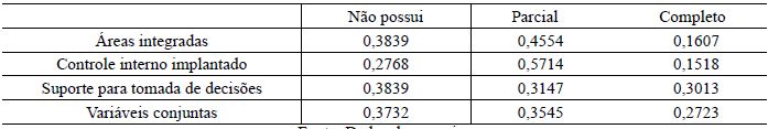 Na Tabela 1 apresenta-se a análise conjunta das variáveis categóricas, cruzando, “proporção de áreas integradas”, com “existência de controle interno” e “suporte para tomada de decisão”. Do total da amostra, 37,32% afirmam não possuir nenhuma dessas categorias. Por outro lado, 27,23% dos escritórios afirmam possuir todas as três categorias.