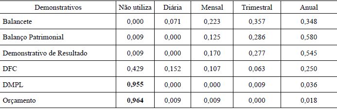 Na visão de Kaplan e Cooper (1998) as organizações de serviços precisam identificar defeitos em seus procedimentos internos capazes de afetar a qualidade dos serviços. Mas, além da informação inadequada, deve-se observar com que frequência os resumos financeiros são emitidos para garantia dos procedimentos operacionais internos. Nota-se, por exemplo, que o orçamento, apesar de bastante enfatizado na academia como um instrumento dos principais instrumentos de controle gerencial, foi indicado pelos respondentes como uma ferramenta não utilizada pela maioria dos escritórios. Dos resultados obtidos, verificou-se que as demonstrações que são menos utilizadas pelos escritórios de contabilidade são: DMPL (95,5%) e orçamento (96,4%), Tabela 3.