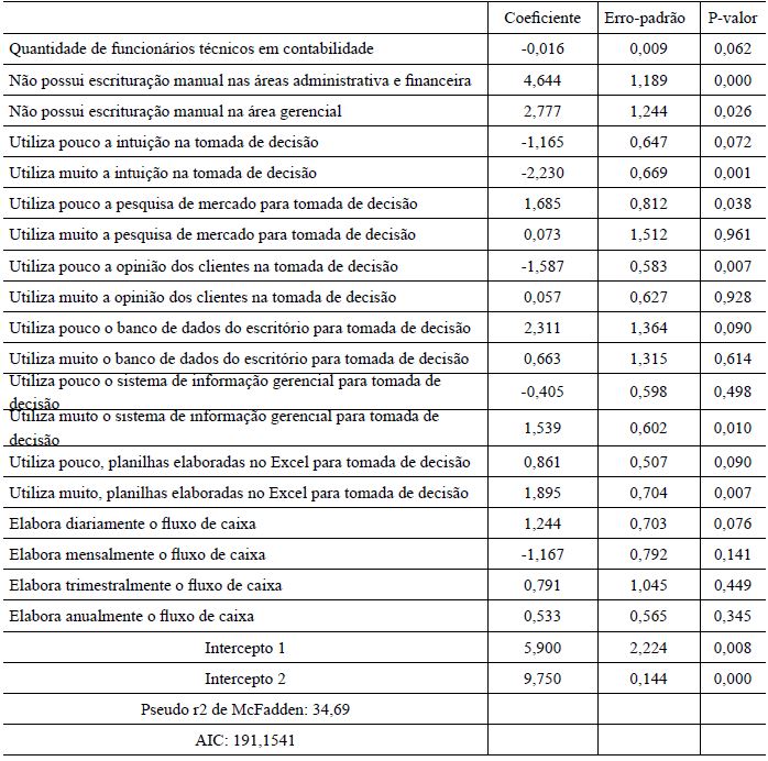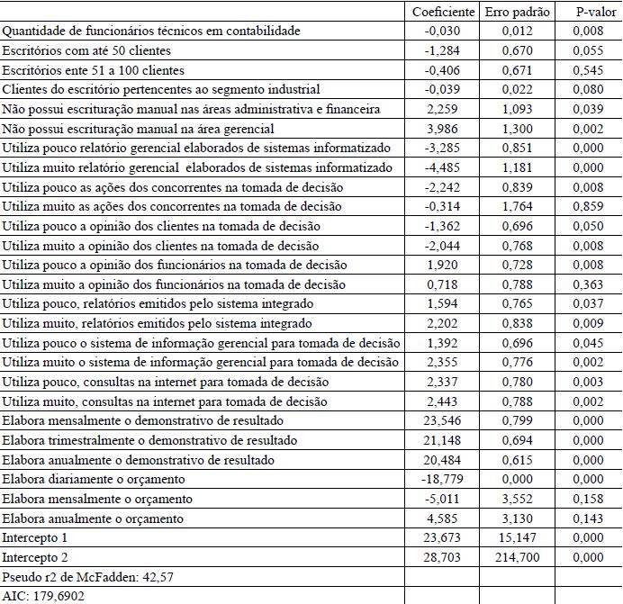 Após a utilização do método Stepwise e avaliação dos VIFs, optou-se por retirar do conjunto as variáveis “elaboração de relatórios gerenciais e orçamento” quando a variável explicada era o sistema integrado dos escritórios. Também foram retiradas as variáveis “relatórios integrados” e “tempo de existência” do escritório por não serem estatisticamente significativas nem mesmo a 10%. No caso de variáveis categóricas, basta uma categoria ser significativa para que todas as demais devam ser mantidas no modelo para efeito de comparação. A Tabela 4 contém os resultados estimados para explicar a variável sistema integrado.