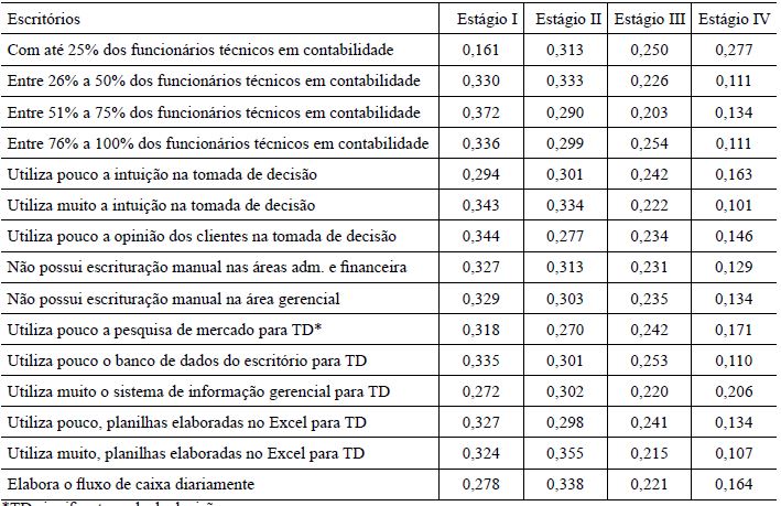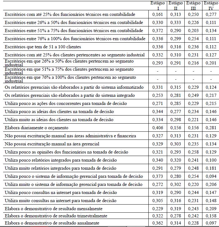 Com relação às variáveis que exercem efeitos positivos e negativos sobre o controle interno dos escritórios, observa-se que parece também não haver um relacionamento geral ou global entre as variáveis que são estatisticamente significativas para explicar o controle interno dos escritórios e os estágios nos quais eles estejam. Entretanto, existe questões que são importantes relatar. Por exemplo, escritórios que elaboram seus demonstrativos de resultado mensalmente, e possuem clientes em maior proporção no setor industrial, são os que, em maiores proporções, encontram-se no estágio IV. Em contraposição, escritórios que utilizam pouco os relatórios integrados ou utilizam pouco o sistema de informação gerencial são os que, em menor proporção, encontram-se no estágio IV. Para finalizar esta seção, são apresentados os resultados obtidos para identificar os estágios dos escritórios a partir das variáveis de controle interno estatisticamente significativas. Logo em seguida apresentam-se as considerações finais, conclusões e recomendações para estudos futuros.