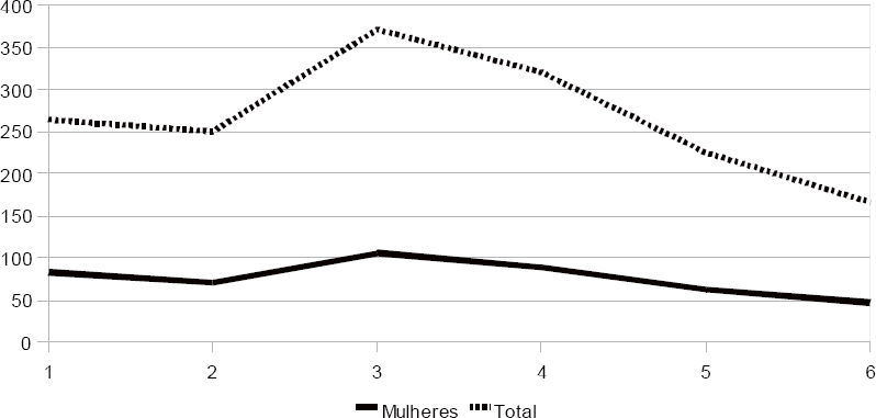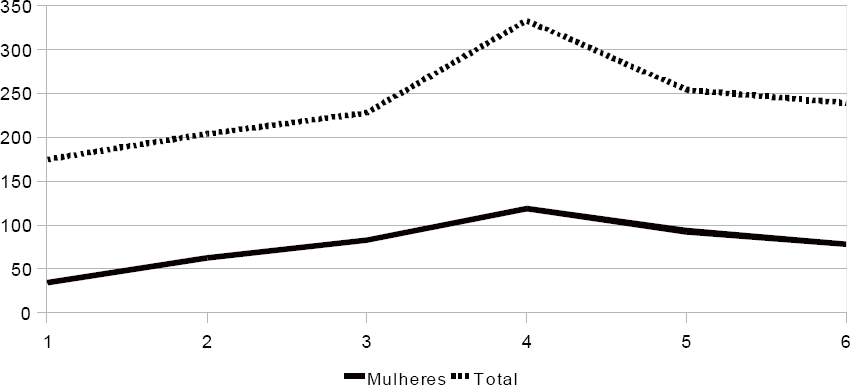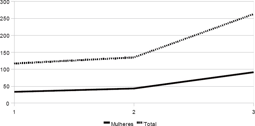 O Gráfico 1 evidencia que o comportamento do gênero feminino assemelha-se ao do total de autores participantes do evento, como pode ser observado, por exemplo, na edição de 2007, quando ocorreu elevação na quantidade total de autores, como também de autoras, em proporção semelhante.