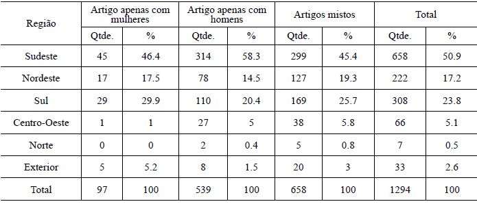 A primeira análise dos dados gerais coletados nos anais dos eventos selecionados foi organizada de forma a identificar a quantidade de artigos com a participação exclusiva de mulheres, bem como a participação exclusiva de homens, além do número de artigos de autoria de homens e mulheres, distribuídos por região geográfica (Tabela 1).