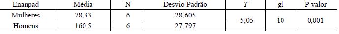 Adicionalmente, foi realizado o teste t de Student, para comparar as médias de participantes no período. A Tabela 10 registra que o teste realizado para o EnANPAD indica que, além de grande, a diferença das médias é significativa (p-valor < 0,05). Os homens participaram, em média, de modo mais intenso do que as mulheres nos eventos da ANPAD.