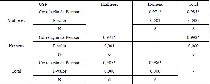 Para o Congresso USP, o resultado do teste de correlação entre os participantes no período de 2004 a 2009 está apresentado na Tabela 11.