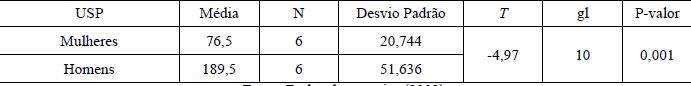 O teste t de Student, que compara as médias de participantes no período de 2004 a 2009 do Congresso USP, indicou, conforme mostra a Tabela 12, uma grande e significativa diferença entre as participações masculina e feminina, evidenciando comportamento semelhante ao apresentado no EnANPAD para o mesmo período, ou seja, homens participando mais do que as mulheres.