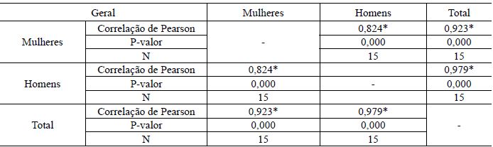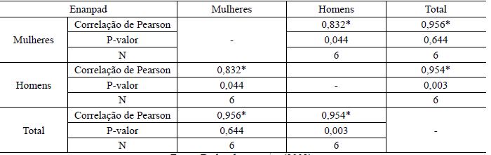 O teste de correlação (correlação de Pearson) realizado para o EnANPAD indicou uma forte correlação entre a quantidade de participantes do gênero feminino e as quantidades de participantes do gênero masculino e total, embora apenas a correlação com a quantidade de participantes do gênero masculino tenha sido significativa (p < 0,05). Por sua vez, a participação dos homens possui correlação bastante significativa com o total de participantes, provavelmente devido à grande quantidade de autores do gênero masculino nos eventos (Tabela 9).